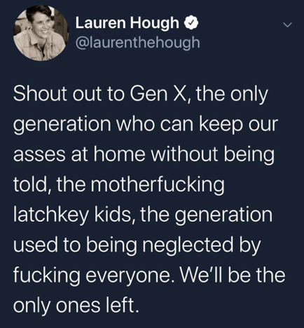 I keep seeing things about how Gen Xers (*technically* the generation I am allegedly, depending on who wants to fight you that day, a part of) are the only group of people prepared for social distancing. Normally I roll my eyes at this kind of boxing in, but I've got to hand it this other Lauren lady. NAILED US.